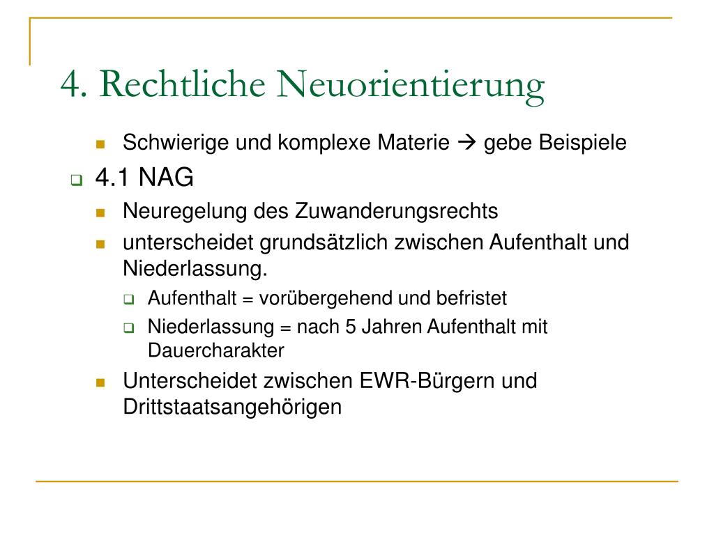 4. Rechtliche Neuorientierung • Schwierige und komplexe Materie gebe Beispiele • 4.1 NAG • Neuregelung des Zuwanderungsrechts • unterscheidet grundsätzlich zwischen Aufenthalt und Niederlassung. • Aufenthalt = vorübergehend und befristet • Niederlassung = nach 5 Jahren Aufenthalt mit Dauercharakter • Unterscheidet zwischen EWR-Bürgern und Drittstaatsangehörigen