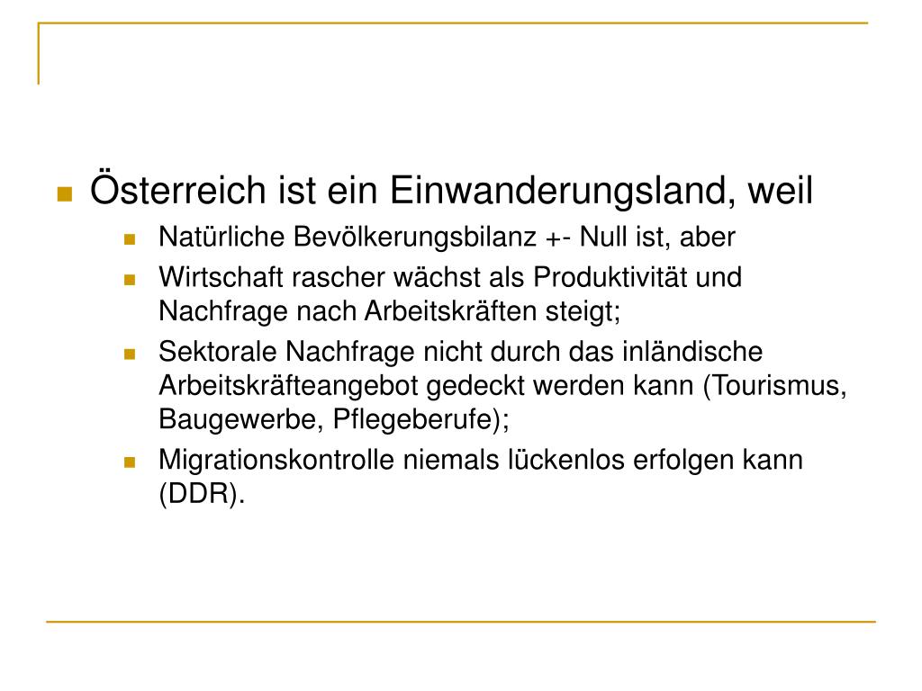 Österreich ist ein Einwanderungsland, weil • Natürliche Bevölkerungsbilanz +- Null ist, aber • Wirtschaft rascher wächst als Produktivität und Nachfrage nach Arbeitskräften steigt; • Sektorale Nachfrage nicht durch das inländische Arbeitskräfteangebot gedeckt werden kann (Tourismus, Baugewerbe, Pflegeberufe); • Migrationskontrolle niemals lückenlos erfolgen kann (DDR).