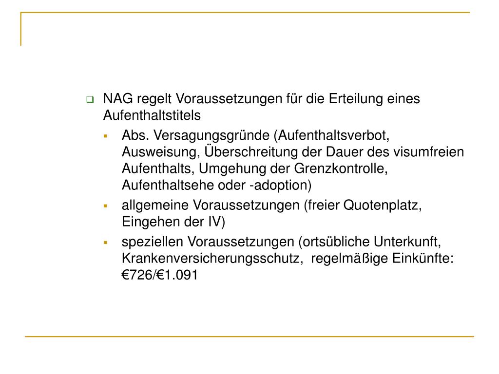 NAG regelt Voraussetzungen für die Erteilung eines Aufenthaltstitels • Abs. Versagungsgründe (Aufenthaltsverbot, Ausweisung, Überschreitung der Dauer des visumfreien Aufenthalts, Umgehung der Grenzkontrolle, Aufenthaltsehe oder -adoption) • allgemeine Voraussetzungen (freier Quotenplatz, Eingehen der IV) • speziellen Voraussetzungen (ortsübliche Unterkunft, Krankenversicherungsschutz, regelmäßige Einkünfte: €726/€1.091