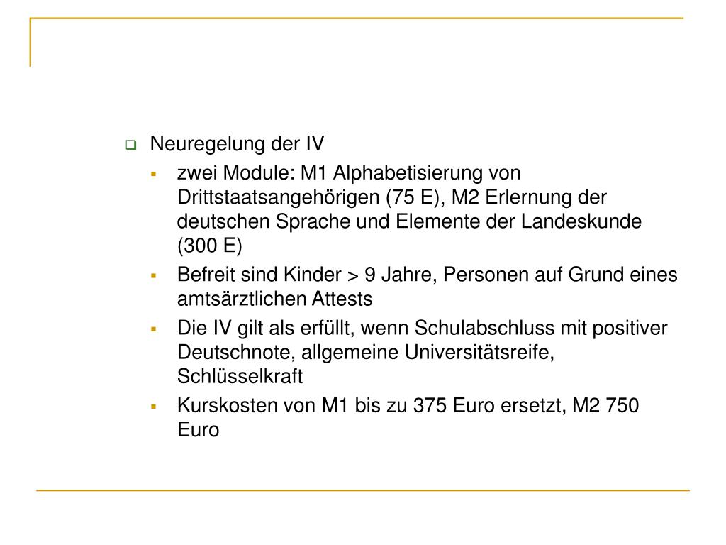 Neuregelung der IV • zwei Module: M1 Alphabetisierung von Drittstaatsangehörigen (75 E), M2 Erlernung der deutschen Sprache und Elemente der Landeskunde (300 E) • Befreit sind Kinder > 9 Jahre, Personen auf Grund eines amtsärztlichen Attests • Die IV gilt als erfüllt, wenn Schulabschluss mit positiver Deutschnote, allgemeine Universitätsreife, Schlüsselkraft • Kurskosten von M1 bis zu 375 Euro ersetzt, M2 750 Euro