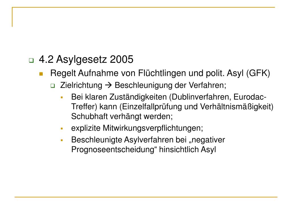 4.2 Asylgesetz 2005 • Regelt Aufnahme von Flüchtlingen und polit. Asyl (GFK) • Zielrichtung Beschleunigung der Verfahren; • Bei klaren Zuständigkeiten (Dublinverfahren, Eurodac-Treffer) kann (Einzelfallprüfung und Verhältnismäßigkeit) Schubhaft verhängt werden; • explizite Mitwirkungsverpflichtungen; • Beschleunigte Asylverfahren bei „negativer Prognoseentscheidung“ hinsichtlich Asyl