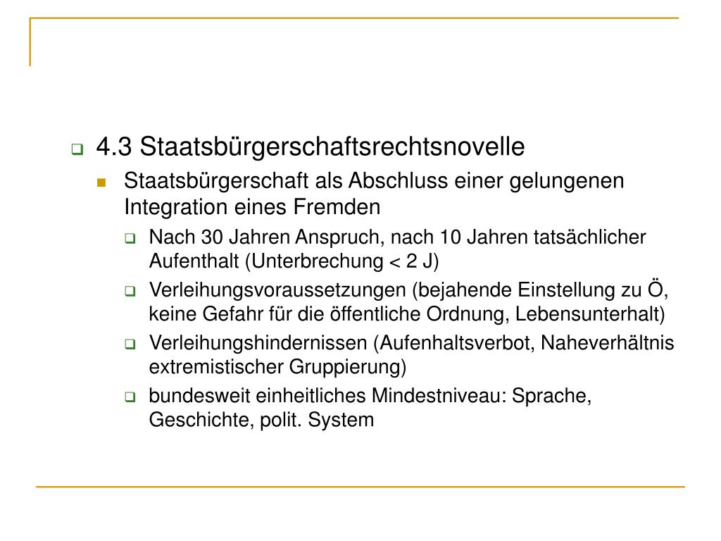 4.3 Staatsbürgerschaftsrechtsnovelle • Staatsbürgerschaft als Abschluss einer gelungenen Integration eines Fremden • Nach 30 Jahren Anspruch, nach 10 Jahren tatsächlicher Aufenthalt (Unterbrechung < 2 J) • Verleihungsvoraussetzungen (bejahende Einstellung zu Ö, keine Gefahr für die öffentliche Ordnung, Lebensunterhalt) • Verleihungshindernissen (Aufenhaltsverbot, Naheverhältnis extremistischer Gruppierung) • bundesweit einheitliches Mindestniveau: Sprache, Geschichte, polit. System