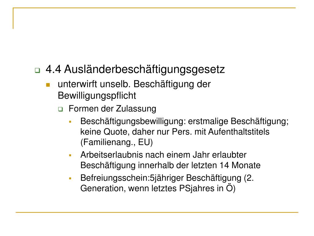 4.4 Ausländerbeschäftigungsgesetz • unterwirft unselb. Beschäftigung der Bewilligungspflicht • Formen der Zulassung • Beschäftigungsbewilligung: erstmalige Beschäftigung; keine Quote, daher nur Pers. mit Aufenthaltstitels (Familienang., EU) • Arbeitserlaubnis nach einem Jahr erlaubter Beschäftigung innerhalb der letzten 14 Monate • Befreiungsschein:5jähriger Beschäftigung (2. Generation, wenn letztes PSjahres in Ö)