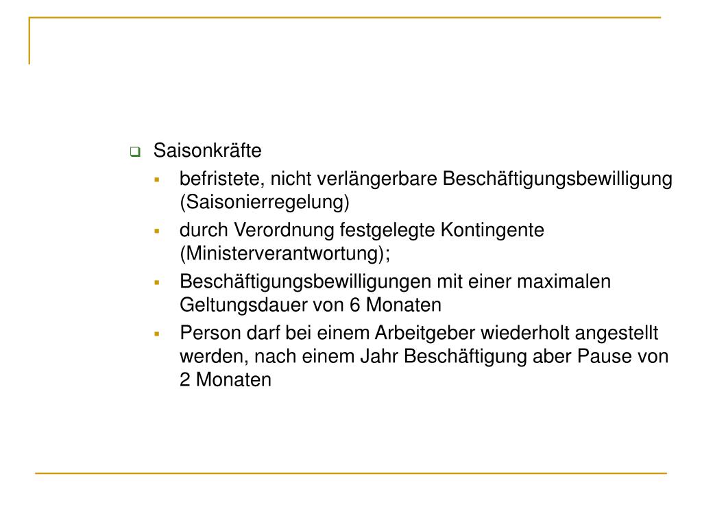 Saisonkräfte • befristete, nicht verlängerbare Beschäftigungsbewilligung (Saisonierregelung) • durch Verordnung festgelegte Kontingente (Ministerverantwortung); • Beschäftigungsbewilligungen mit einer maximalen Geltungsdauer von 6 Monaten • Person darf bei einem Arbeitgeber wiederholt angestellt werden, nach einem Jahr Beschäftigung aber Pause von 2 Monaten