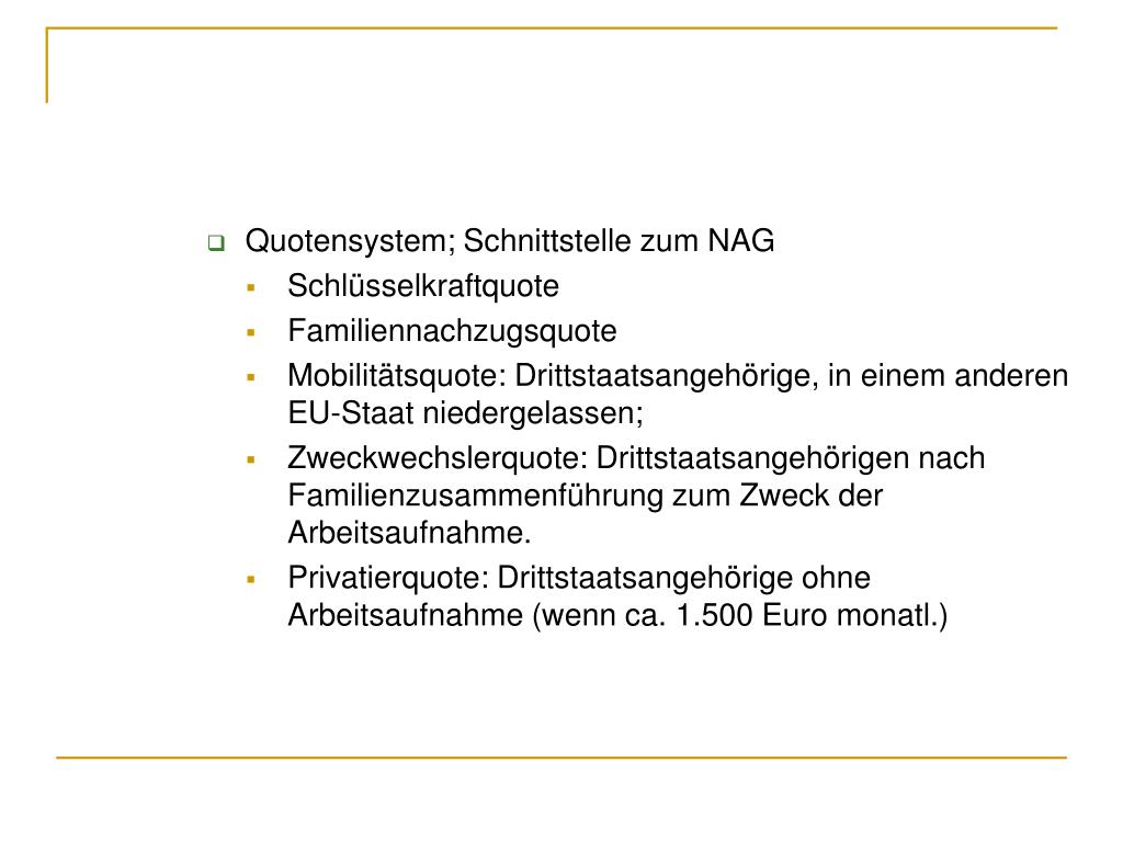 Quotensystem; Schnittstelle zum NAG • Schlüsselkraftquote • Familiennachzugsquote • Mobilitätsquote: Drittstaatsangehörige, in einem anderen EU-Staat niedergelassen; • Zweckwechslerquote: Drittstaatsangehörigen nach Familienzusammenführung zum Zweck der Arbeitsaufnahme. • Privatierquote: Drittstaatsangehörige ohne Arbeitsaufnahme (wenn ca. 1.500 Euro monatl.)
