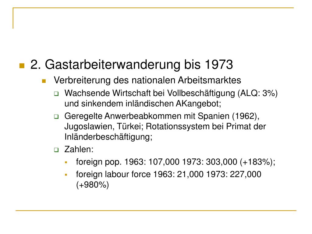 2. Gastarbeiterwanderung bis 1973 • Verbreiterung des nationalen Arbeitsmarktes • Wachsende Wirtschaft bei Vollbeschäftigung (ALQ: 3%) und sinkendem inländischen AKangebot; • Geregelte Anwerbeabkommen mit Spanien (1962), Jugoslawien, Türkei; Rotationssystem bei Primat der Inländerbeschäftigung; • Zahlen: • foreign pop. 1963: 107,000 1973: 303,000 (+183%); • foreign labour force 1963: 21,000 1973: 227,000 (+980%)