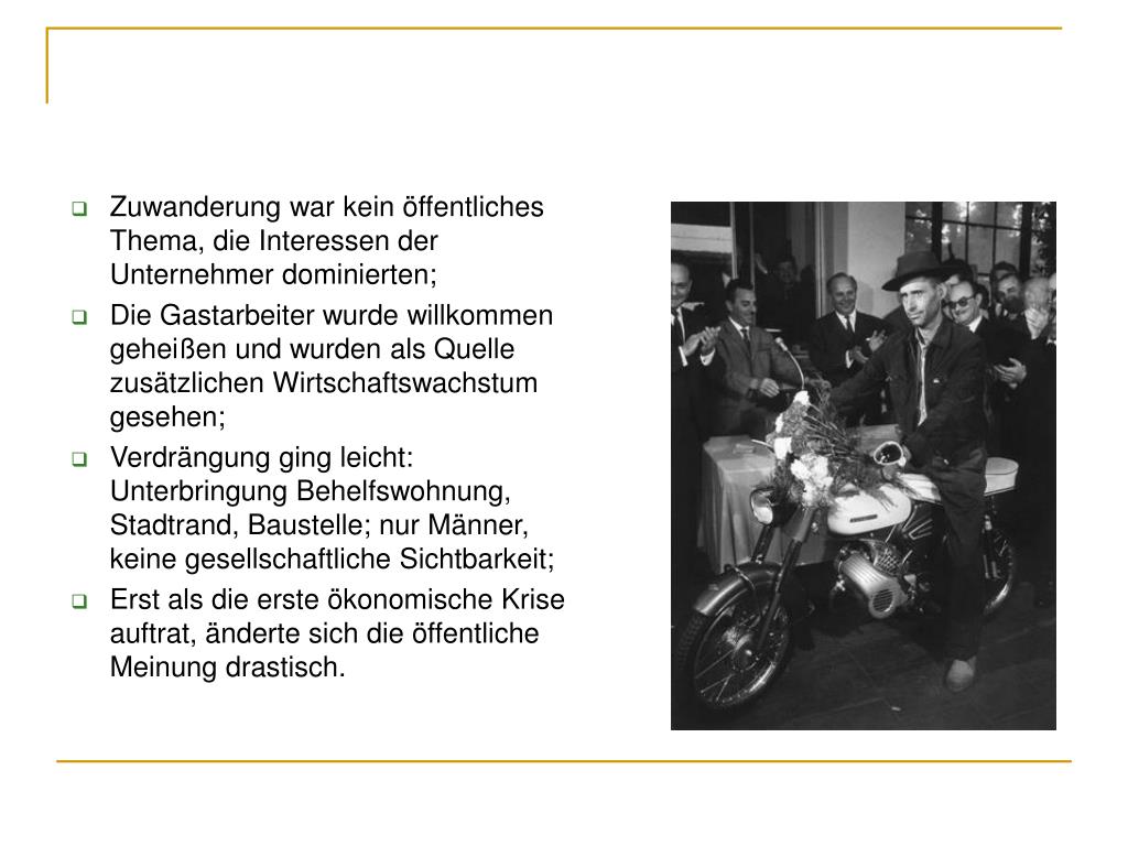 Zuwanderung war kein öffentliches Thema, die Interessen der Unternehmer dominierten; • Die Gastarbeiter wurde willkommen geheißen und wurden als Quelle zusätzlichen Wirtschaftswachstum gesehen; • Verdrängung ging leicht: Unterbringung Behelfswohnung, Stadtrand, Baustelle; nur Männer, keine gesellschaftliche Sichtbarkeit; • Erst als die erste ökonomische Krise auftrat, änderte sich die öffentliche Meinung drastisch.