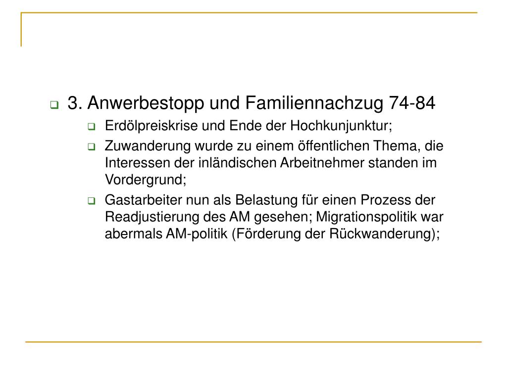 3. Anwerbestopp und Familiennachzug 74-84 • Erdölpreiskrise und Ende der Hochkunjunktur; • Zuwanderung wurde zu einem öffentlichen Thema, die Interessen der inländischen Arbeitnehmer standen im Vordergrund; • Gastarbeiter nun als Belastung für einen Prozess der Readjustierung des AM gesehen; Migrationspolitik war abermals AM-politik (Förderung der Rückwanderung);