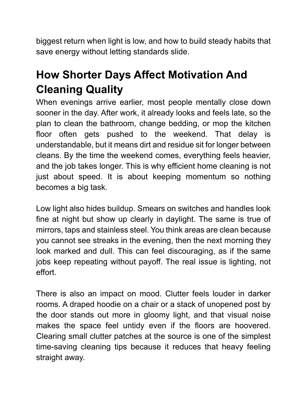 2. biggest return when light is low, and how to build steady habits that save energy without letting standards slide. How Shorter Days Affect Motivation And Cleaning Quality When evenings arrive earlier, most people mentally close down sooner in the day. After work, it already looks and feels late, so the plan to clean the bathroom, change bedding, or mop the kitchen floor often gets pushed to the weekend. That delay is understandable, but it means dirt and residue sit for longer between cleans. By the time the weekend comes, everything feels heavier, and the job takes longer. This is why efficient home cleaning is not just about speed. It is about keeping momentum so nothing becomes a big task. Low light also hides buildup. Smears on switches and handles look fine at night but show up clearly in daylight. The same is true of mirrors, taps and stainless steel. You think areas are clean because you cannot see streaks in the evening, then the next morning they look marked and dull. This can feel discouraging, as if the same jobs keep repeating without payoff. The real issue is lighting, not effort. There is also an impact on mood. Clutter feels louder in darker rooms. A draped hoodie on a chair or a stack of unopened post by the door stands out more in gloomy light, and that visual noise makes the space feel untidy even if the floors are hoovered. Clearing small clutter patches at the source is one of the simplest time-saving cleaning tips because it reduces that heavy feeling straight away.