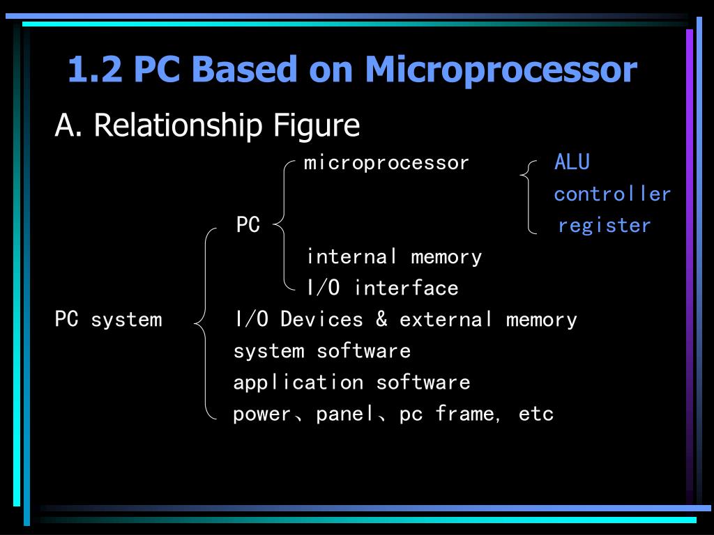 1.2 PC Based on Microprocessor A. Relationship Figure microprocessor ALU controller PC register internal memory I/O interface PC system I/O Devices & external memory system software application software power、panel、pc frame, etc