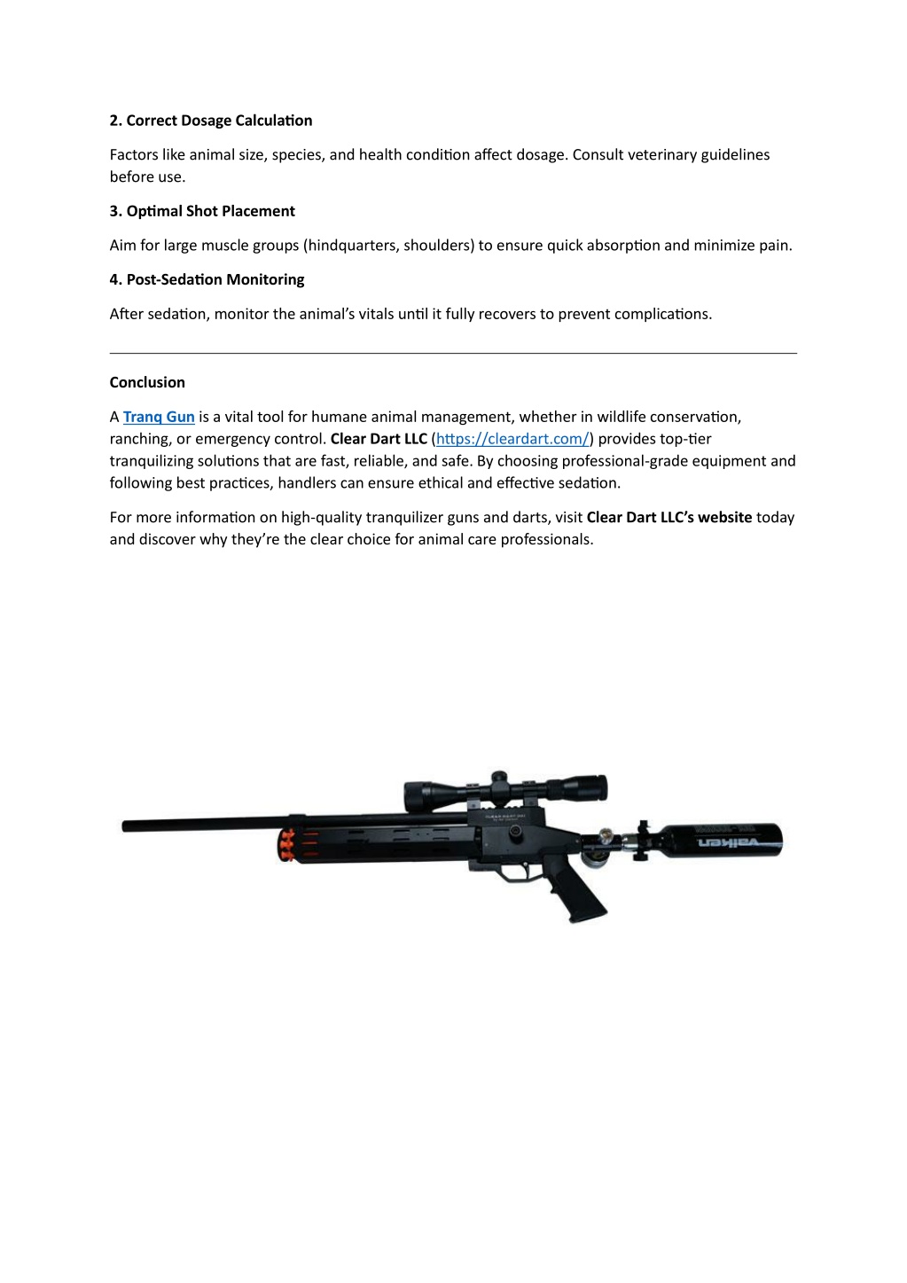 1. Accurate & Long-Range A high-quality Tranq Gun should have: • Adjustable sights or scopes for precision • Sufficient range (typically 20-50 yards) to keep handlers at a safe distance 2. Fast-Acting & Reliable Sedation The dart should deliver medication quickly to prevent prolonged stress or escape. Clear Dart LLC’s solutions are formulated for rapid absorption. 3. Safe & Humane Proper dosing is critical—too little may not sedate the animal, while too much can be fatal. Clear Dart’s products are designed for optimal safety. 4. Durable & Easy to Maintain A Tranq Gun must withstand rugged conditions. Look for corrosion-resistant materials and easy- loading mechanisms. Why Choose Clear Dart LLC? Clear Dart LLC (https://cleardart.com/) is a leader in tranquilizing solutions, offering: 1. Professional-Grade Equipment Their Tranq Guns and darts are trusted by veterinarians, ranchers, and wildlife experts for reliability and effectiveness. 2. Fast-Acting Formulas Clear Dart’s sedation solutions work quickly, reducing stress on animals and improving handler safety. 3. Ethical & Safe Practices All products are designed with animal welfare in mind, ensuring humane sedation with minimal side effects. 4. Expert Support & Training Clear Dart provides guidance on proper usage, dosage calculations, and best practices for safe sedation. Best Practices for Using a Tranq Gun To ensure safety and effectiveness, follow these guidelines: 1. Proper Training Only trained professionals should handle tranquilizer guns. Misuse can lead to injury or animal harm.