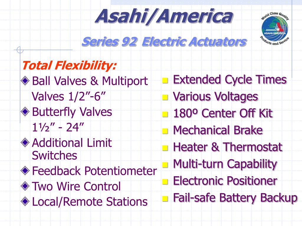 Asahi/America Series 92Electric Actuators Total Flexibility: • Ball Valves & Multiport Valves 1/2”-6” • Butterfly Valves 1½” - 24” • Additional Limit Switches • Feedback Potentiometer • Two Wire Control • Local/Remote Stations • Extended Cycle Times • Various Voltages • 180º Center Off Kit • Mechanical Brake • Heater & Thermostat • Multi-turn Capability • Electronic Positioner • Fail-safe Battery Backup