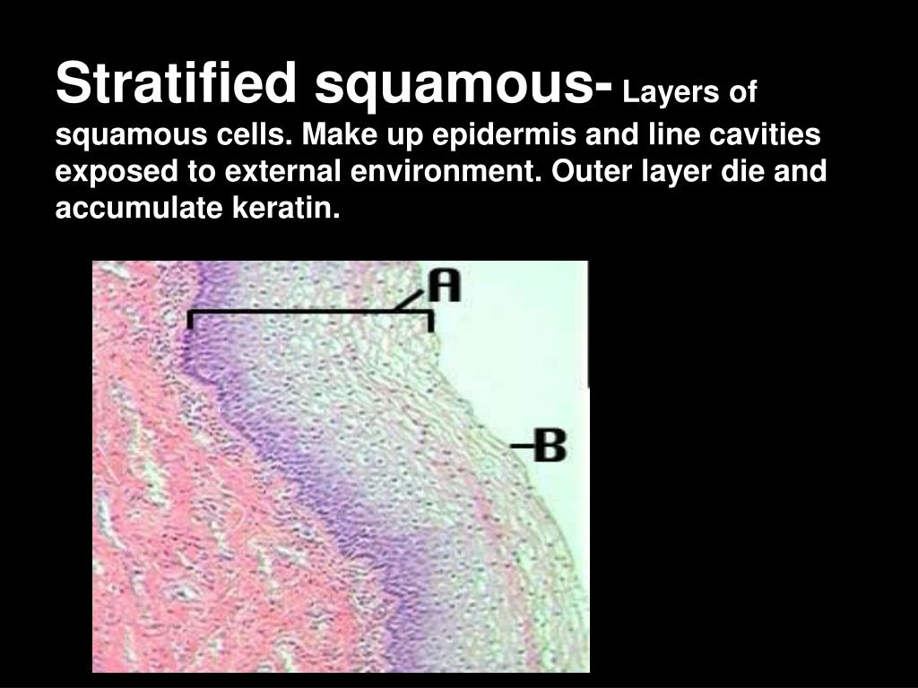 Stratified squamous-Layers of squamous cells. Make up epidermis and line cavities exposed to external environment. Outer layer die and accumulate keratin.