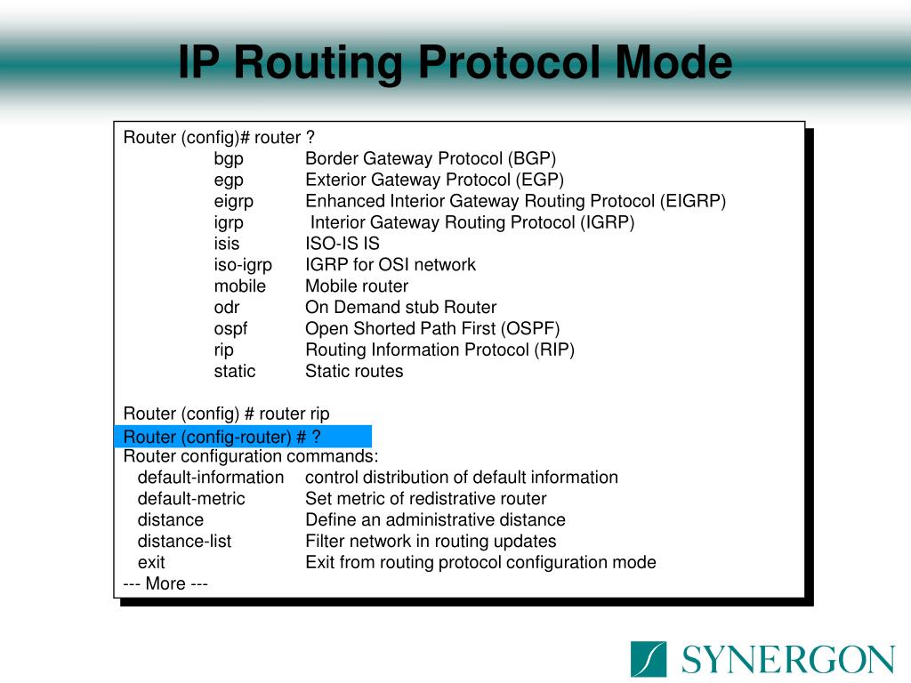 IP Routing Protocol Mode Router (config)# router ? bgp Border Gateway Protocol (BGP) egp Exterior Gateway Protocol (EGP) eigrp Enhanced Interior Gateway Routing Protocol (EIGRP) igrp Interior Gateway Routing Protocol (IGRP) isis ISO-IS IS iso-igrp IGRP for OSI network mobile Mobile router odr On Demand stub Router ospf Open Shorted Path First (OSPF) rip Routing Information Protocol (RIP) static Static routes Router (config) # router rip Router configuration commands: default-information control distribution of default information default-metric Set metric of redistrative router distance Define an administrative distance distance-list Filter network in routing updates exit Exit from routing protocol configuration mode --- More --- Router (config-router) # ?