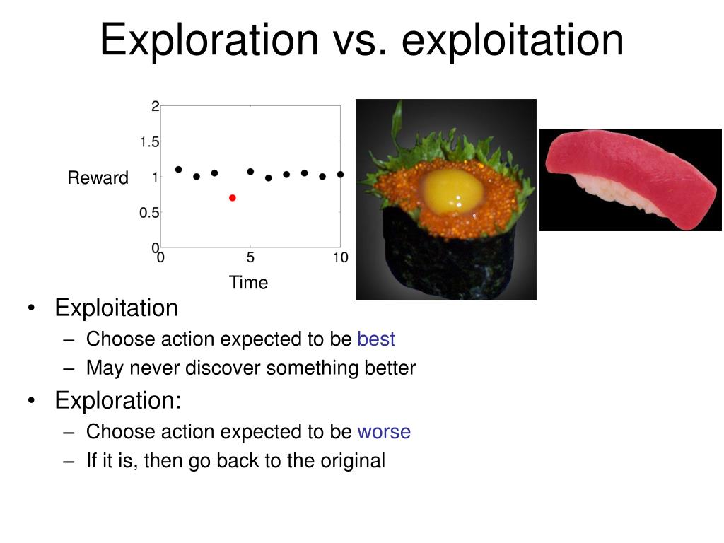 Exploration vs. exploitation • Exploitation • Choose action expected to be best • May never discover something better • Exploration: • Choose action expected to be worse • If it is, then go back to the original Reward Time