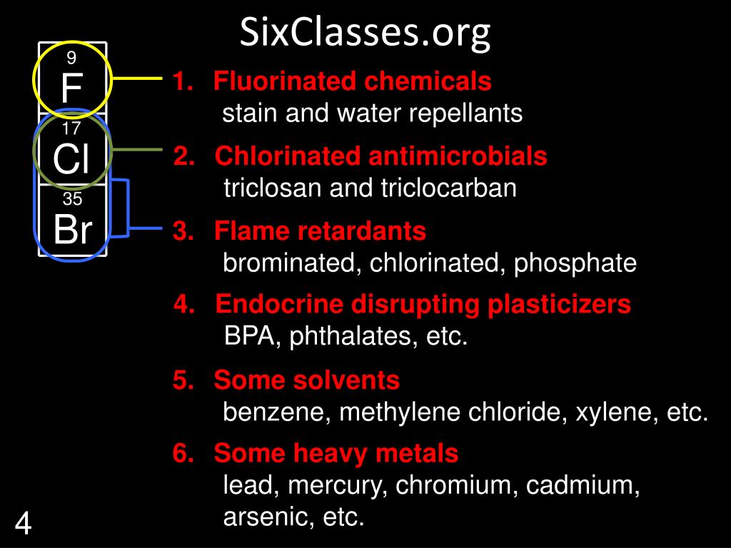 SixClasses.org 9 F • Fluorinated chemicals • stain and water repellants 17 Cl • Chlorinated antimicrobials • triclosan and triclocarban 35 Br • Flame retardants • brominated, chlorinated, phosphate • Endocrine disrupting plasticizers • BPA, phthalates, etc. • Some solvents • benzene, methylene chloride, xylene, etc. • Some heavy metals • lead, mercury, chromium, cadmium, arsenic, etc. 4