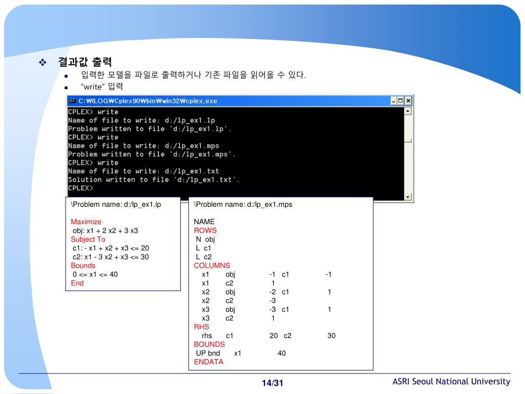 파일 입력 • C:\ILOG\Cplex90\bin\win31\ 아래의 txt파일 작성 (LP format or MPS)) • 실행 • 문제 읽기 • CPLEX> read LP_ex1.txt lp • 최적해 수행 • CPLEX> op • 결과보기 • dis sol var – maximize X1 + 2 X2 + 3 X3 subject to -X1 + X2 + X3 <= 20 X1 - 3 X2 + X3 <= 30 bounds 0 <= X1 <= 40 end