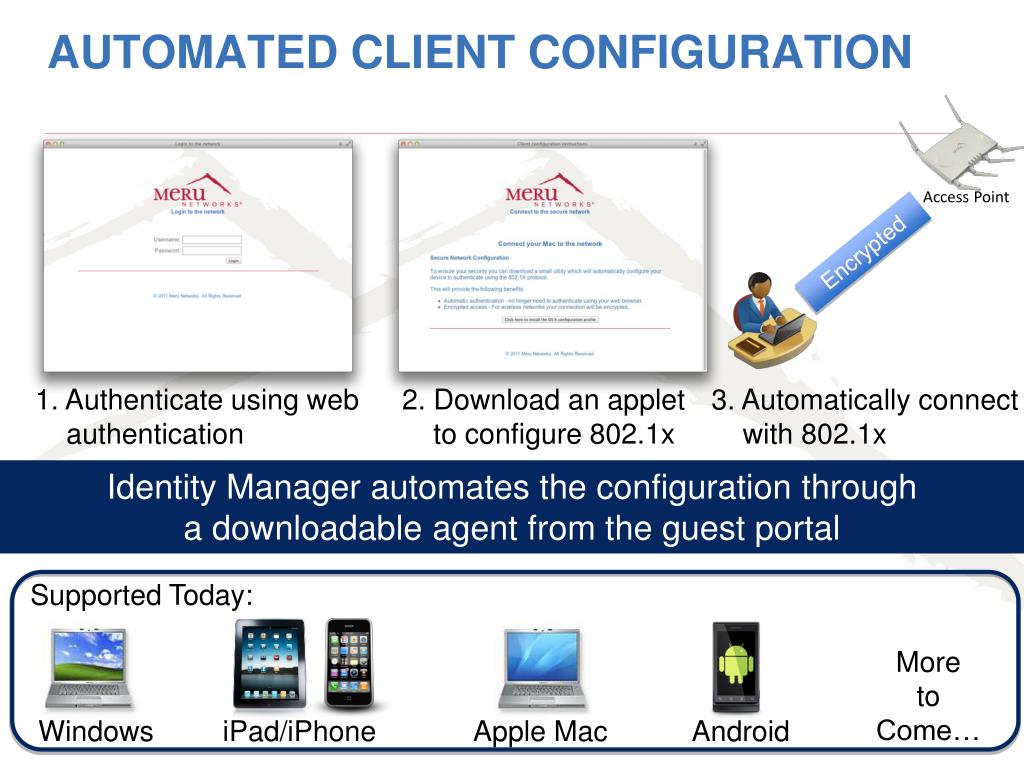 AUTOMATED CLIENT CONFIGURATION Access Point Encrypted 1. Authenticate using web authentication 2. Download an applet to configure 802.1x 3. Automatically connect with 802.1x Identity Manager automates the configuration through a downloadable agent from the guest portal Supported Today: More to Come… Windows iPad/iPhone Apple Mac Android