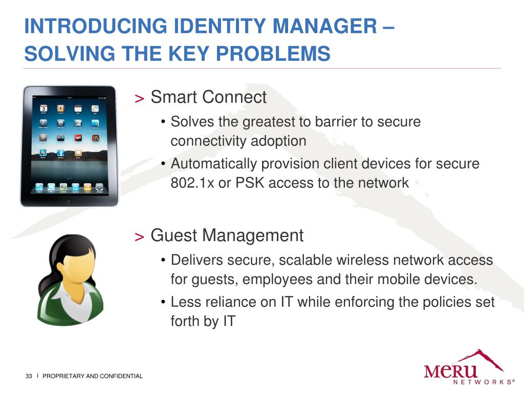 INTRODUCING IDENTITY MANAGER – SOLVING THE KEY PROBLEMS • Smart Connect • Solves the greatest to barrier to secure connectivity adoption • Automatically provision client devices for secure 802.1x or PSK access to the network • Guest Management • Delivers secure, scalable wireless network access for guests, employees and their mobile devices. • Less reliance on IT while enforcing the policies set forth by IT
