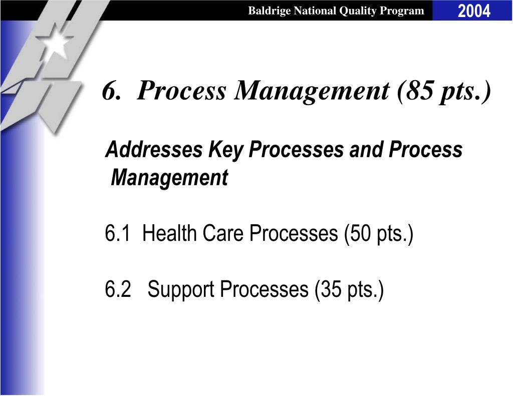 6. Process Management (85 pts.) Addresses Key Processes and Process Management 6.1 Health Care Processes (50 pts.) 6.2 Support Processes (35 pts.)