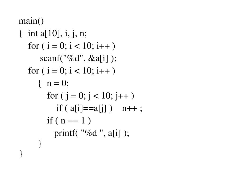 例5:输入10个数,输出这10个数中仅出现一次的 数。 如输入:12 36 72 36 87 99 87 87 12 35 则输出:72 99 35 • 设一计数变量n,统计一个数出现次数。 • 基本算法思想 对于每个数,与全部数一一比较,如遇相等,则 n加1。 一个数与全部数一一比较完后,如计数值n为1, 则表示该数仅出现一次,输出该数。