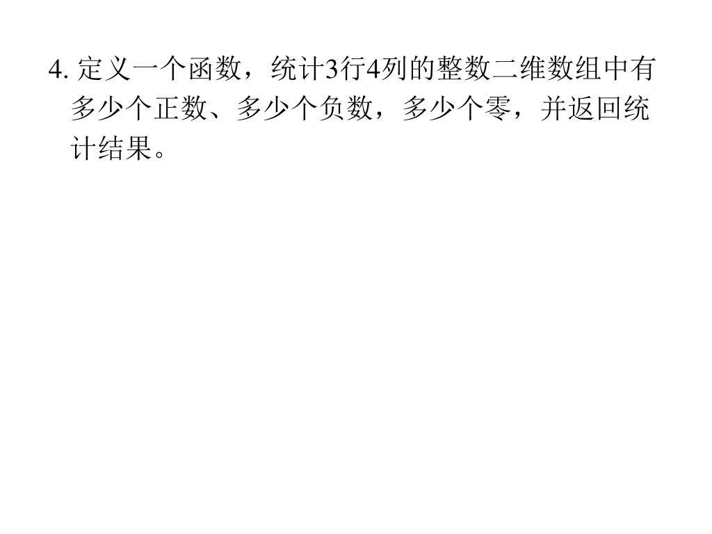 4. 定义一个函数,统计3行4列的整数二维数组中有 多少个正数、多少个负数,多少个零,并返回统 计结果。