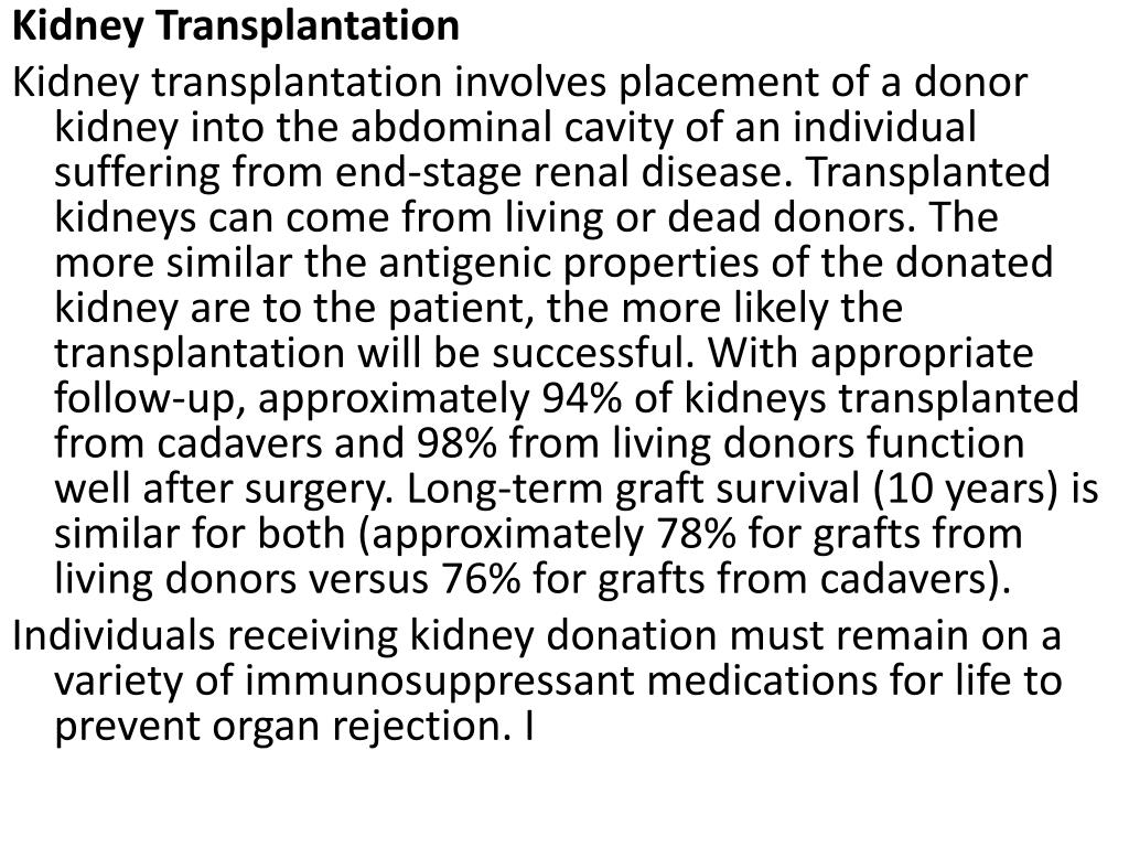 Kidney Transplantation Kidney transplantation involves placement of a donor kidney into the abdominal cavity of an individual suffering from end-stage renal disease. Transplanted kidneys can come from living or dead donors. The more similar the antigenic properties of the donated kidney are to the patient, the more likely the transplantation will be successful. With appropriate follow-up, approximately 94% of kidneys transplanted from cadavers and 98% from living donors function well after surgery. Long-term graft survival (10 years) is similar for both (approximately 78% for grafts from living donors versus 76% for grafts from cadavers). Individuals receiving kidney donation must remain on a variety of immunosuppressant medications for life to prevent organ rejection. I