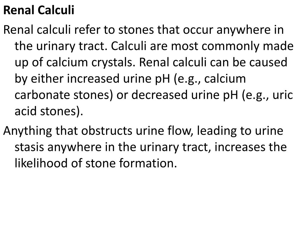 Renal Calculi Renal calculi refer to stones that occur anywhere in the urinary tract. Calculi are most commonly made up of calcium crystals. Renal calculi can be caused by either increased urine pH (e.g., calcium carbonate stones) or decreased urine pH (e.g., uric acid stones). Anything that obstructs urine flow, leading to urine stasis anywhere in the urinary tract, increases the likelihood of stone formation.