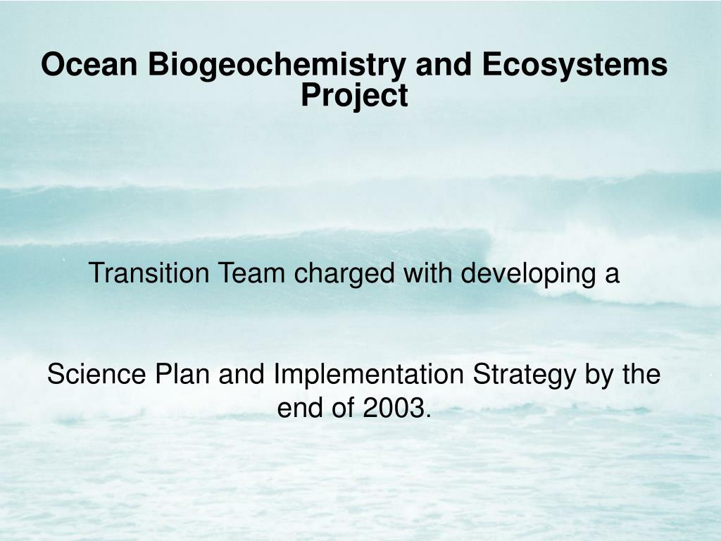 Ocean Biogeochemistry and Ecosystems Project Transition Team charged with developing a Science Plan and Implementation Strategy by the end of 2003.
