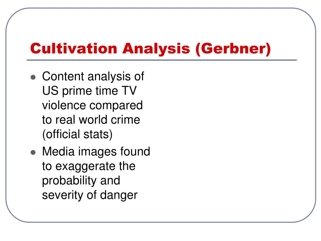 Media found to exaggerate probability and severity of danger This is said to “cultivate” image of world that is scary and mean Leading to unnecessary anxiety about risk of violent crime Cultivation Theory