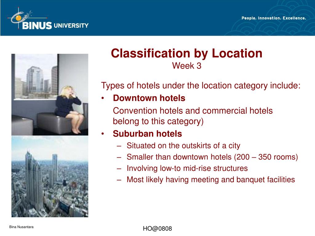 Classification by LocationWeek 3 Types of hotels under the location category include: • Downtown hotels Convention hotels and commercial hotels belong to this category) • Suburban hotels • Situated on the outskirts of a city • Smaller than downtown hotels (200 – 350 rooms) • Involving low-to mid-rise structures • Most likely having meeting and banquet facilities HO@0808