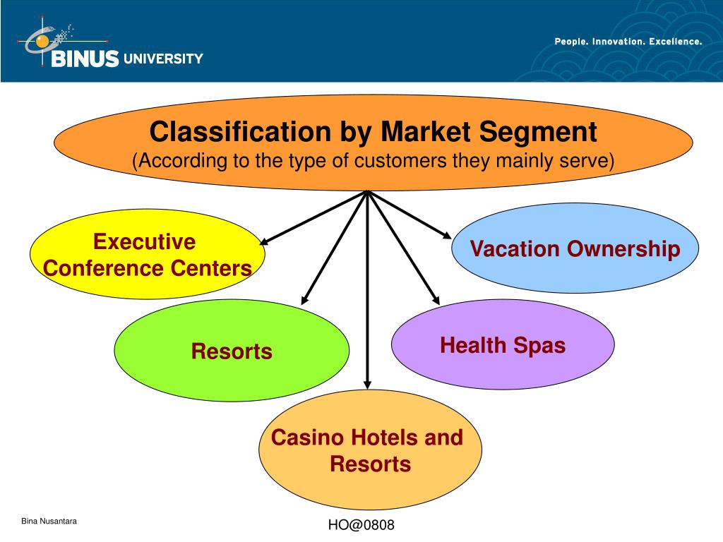 Classification by Market Segment (According to the type of customers they mainly serve) Vacation Ownership Executive Conference Centers Resorts Health Spas Casino Hotels and Resorts HO@0808