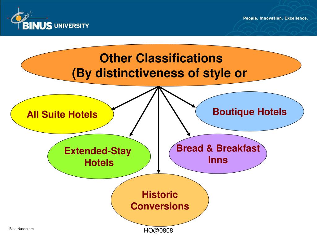 Other Classifications (By distinctiveness of style or Boutique Hotels All Suite Hotels Extended-Stay Hotels Bread & Breakfast Inns Historic Conversions HO@0808
