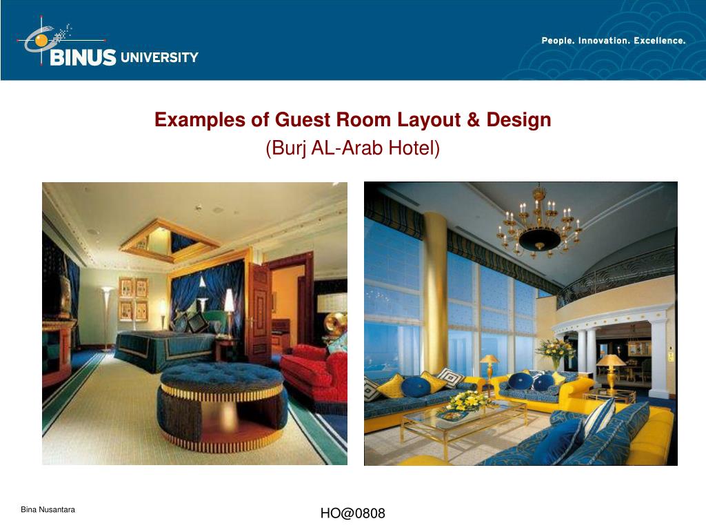 Room Layout and DesignWeek 3 • The layout and design of guest accommodations are determined by the type of the establishment. • For example, in a budget/ economy motel, guest rooms are smaller, simpler and more compact than those in a traditional luxury resort. HO@0808