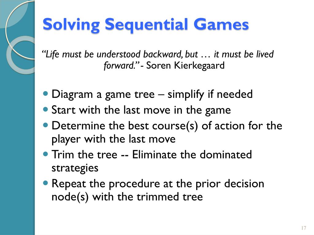 Solving Sequential Games “Life must be understood backward, but … it must be lived forward.” - Soren Kierkegaard • Diagram a game tree – simplify if needed • Start with the last move in the game • Determine the best course(s) of action for the player with the last move • Trim the tree -- Eliminate the dominated strategies • Repeat the procedure at the prior decision node(s) with the trimmed tree