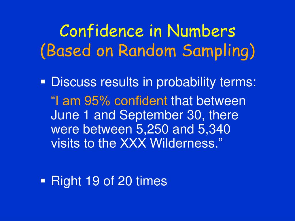 Confidence in Numbers(Based on Random Sampling) • Discuss results in probability terms: “I am 95% confident that between June 1 and September 30, there were between 5,250 and 5,340 visits to the XXX Wilderness.” • Right 19 of 20 times