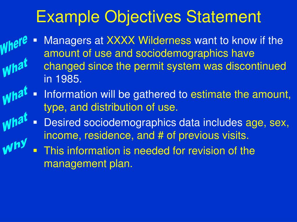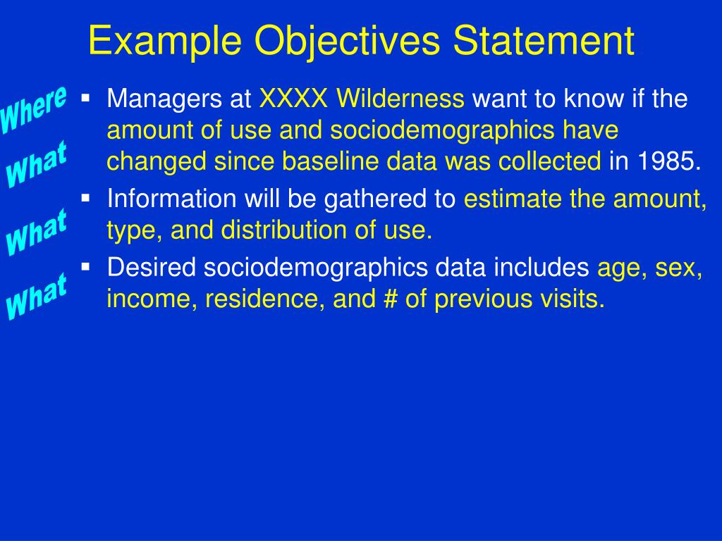 Example Objectives Statement Where What • Managers at XXXX Wilderness want to know if the amount of use and sociodemographics have changed since the permit system was discontinued in 1985. • Information will be gathered to estimate the amount, type, and distribution of use. • Desired sociodemographics data includes age, sex, income, residence, and # of previous visits. • This information is needed for revision of the management plan. What What Why