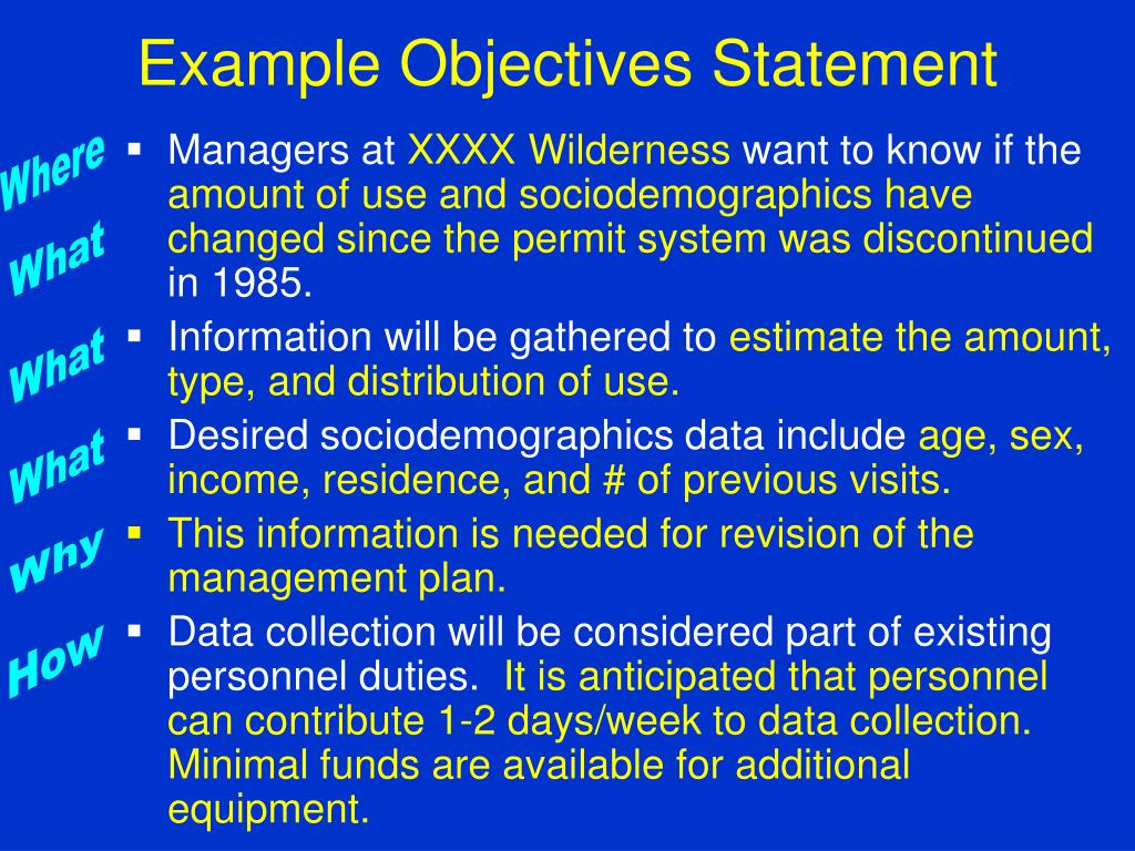 Example Objectives Statement Where What • Managers at XXXX Wilderness want to know if the amount of use and sociodemographics have changed since the permit system was discontinued in 1985. • Information will be gathered to estimate the amount, type, and distribution of use. • Desired sociodemographics data include age, sex, income, residence, and # of previous visits. • This information is needed for revision of the management plan. • Data collection will be considered part of existing personnel duties. It is anticipated that personnel can contribute 1-2 days/week to data collection. Minimal funds are available for additional equipment. What What Why How