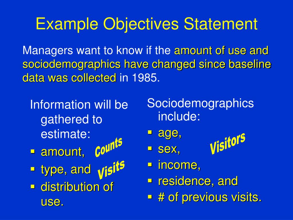 Example Objectives Statement Managers want to know if the amount of use and sociodemographics have changed since baseline data was collectedin 1985. Information will be gathered to estimate: • amount, • type, and • distribution of use. Sociodemographics include: • age, • sex, • income, • residence, and • # of previous visits. Visitors Counts Visits