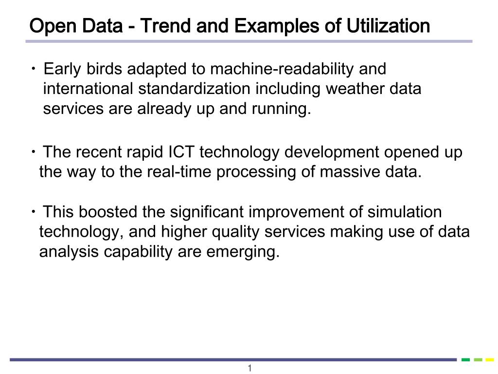 OpenData-TrendandExamplesofUtilization ・Earlybirds adapted to machine-readability and international standardization including weather data services are already up and running. ・ The recent rapid ICT technology development opened up the way to the real-time processing of massive data. ・ This boosted the significant improvement of simulation technology, and higher quality services making use of data analysis capabilityare emerging.