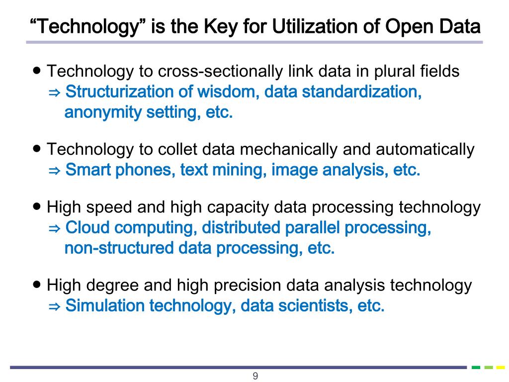 “Technology” is the Key for Utilization of Open Data ● Technology to cross-sectionally link data in plural fields ⇒ Structurizationofwisdom,data standardization, anonymity setting, etc. ● Technology to collet data mechanically and automatically ⇒ Smart phones, text mining, image analysis, etc. ● Highspeedandhigh capacity dataprocessing technology ⇒ Cloud computing, distributed parallel processing, non-structured data processing, etc. ● High degree and high precision data analysis technology ⇒ Simulation technology, data scientists, etc.