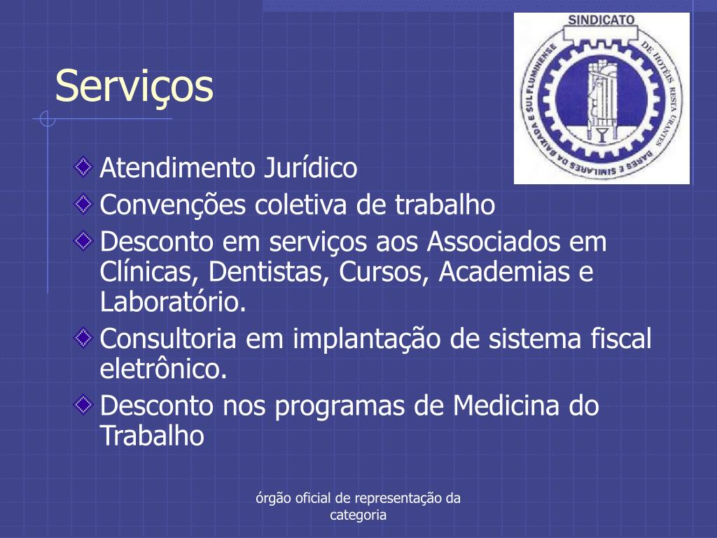 Serviços • Atendimento Jurídico • Convenções coletiva de trabalho • Desconto em serviços aos Associados em Clínicas, Dentistas, Cursos, Academias e Laboratório. • Consultoria em implantação de sistema fiscal eletrônico. • Desconto nos programas de Medicina do Trabalho órgão oficial de representação da categoria