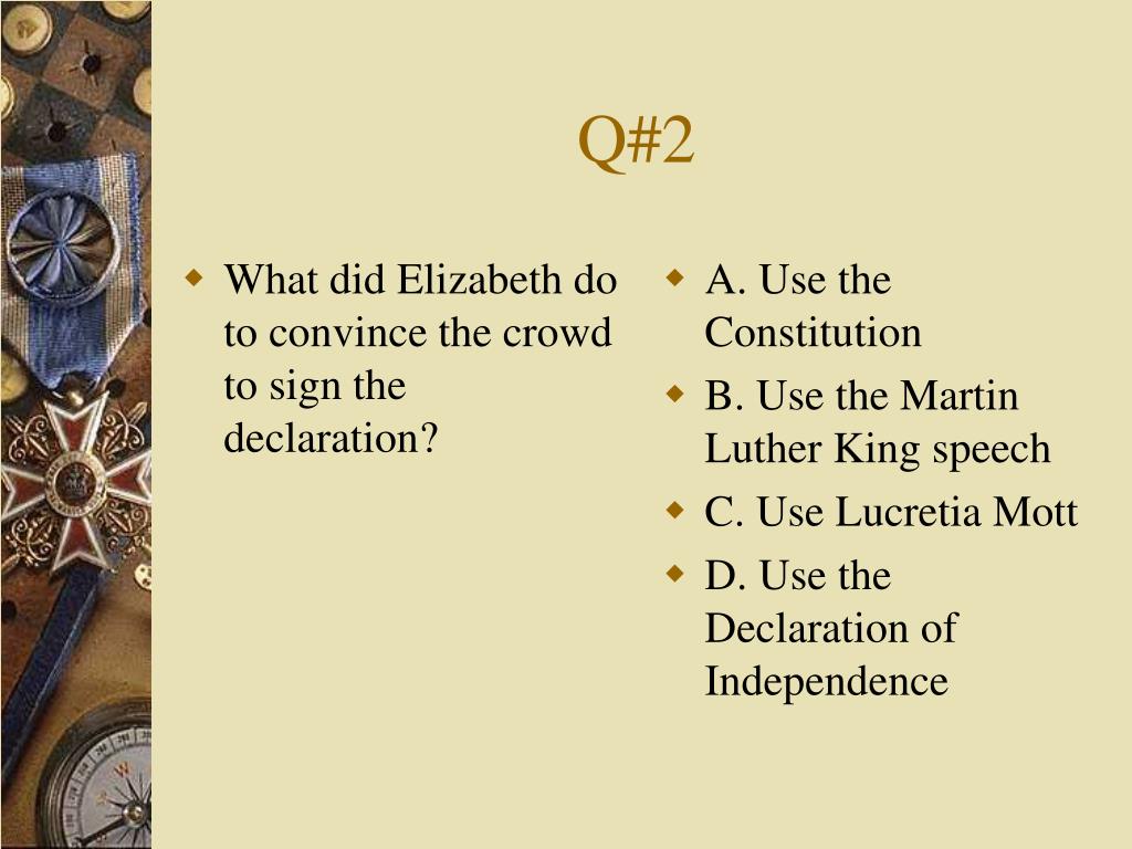 What did Elizabeth do to convince the crowd to sign the declaration? A. Use the Constitution B. Use the Martin Luther King speech C. Use Lucretia Mott D. Use the Declaration of Independence Q#2