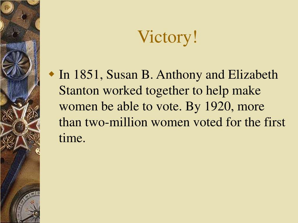 Victory! • In 1851, Susan B. Anthony and Elizabeth Stanton worked together to help make women be able to vote. By 1920, more than two-million women voted for the first time.