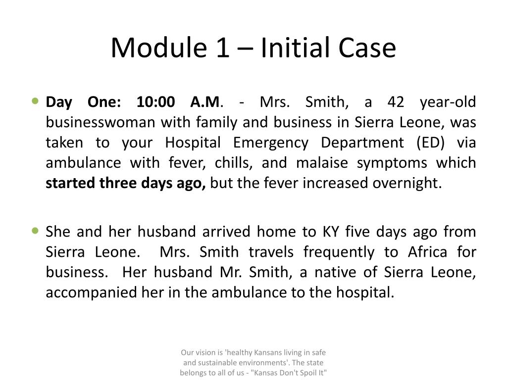 Module 1 – Initial Case • Day One: 10:00 A.M. - Mrs. Smith, a 42 year-old businesswoman with family and business in Sierra Leone, was taken to your Hospital Emergency Department (ED) via ambulance with fever, chills, and malaise symptoms which started three days ago, but the fever increased overnight. • She and her husband arrived home to KY five days ago from Sierra Leone. Mrs. Smith travels frequently to Africa for business. Her husband Mr. Smith, a native of Sierra Leone, accompanied her in the ambulance to the hospital. Our vision is 'healthy Kansans living in safe and sustainable environments'. The state belongs to all of us - "Kansas Don't Spoil It"