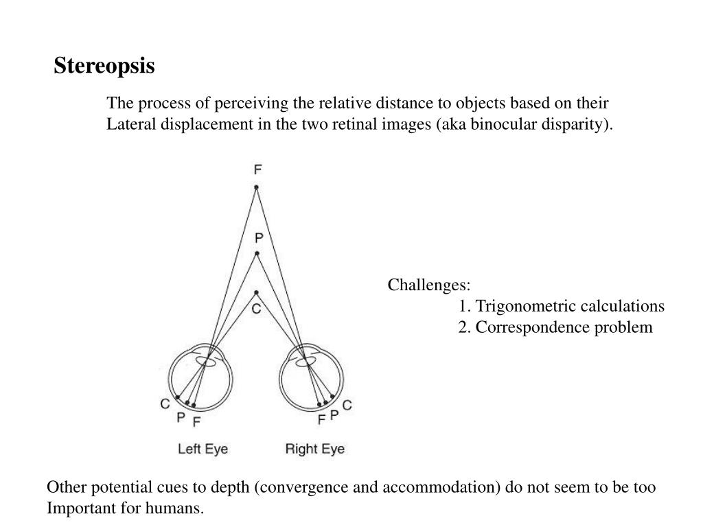 Stereopsis The process of perceiving the relative distance to objects based on their Lateral displacement in the two retinal images (aka binocular disparity). Challenges: 1. Trigonometric calculations 2. Correspondence problem Other potential cues to depth (convergence and accommodation) do not seem to be too Important for humans.