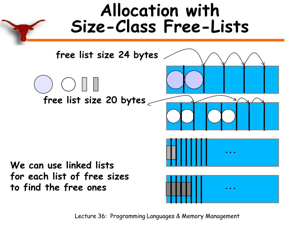 Allocation withSize-Class Free-Lists free list size 24 bytes free list size 20 bytes ... We can use linked lists for each list of free sizes to find the free ones ... Lecture 36: Programming Languages & Memory Management