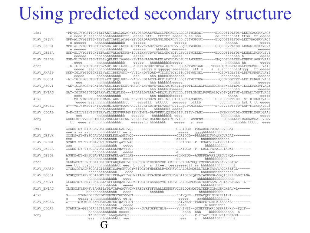 Using predicted secondary structure 1fx1 -PK-ALIVYGSTTGNTEYTAETIARQLANAG-YEVDSRDAASVEAGGLFEGFDLVLLGCSTWGDDSI------ELQDDFIPLFDS-LEETGAQGRKVACF e eeee b ssshhhhhhhhhhhhhhttt eeeee stt tttttt seeee b ee sss ee ttthhhhtt ttss tt eeeee FLAV_DESVH MPK-ALIVYGSTTGNTEYTaETIARELADAG-YEVDSRDAASVEAGGLFEGFDLVLLgCSTWGDDSI------ELQDDFIPLFDS-LEETGAQGRKVACf e eeeeee hhhhhhhhhhhhhhh eeeeee eeeeee hhhhhh eeeee FLAV_DESGI MPK-ALIVYGSTTGNTEGVaEAIAKTLNSEG-METTVVNVADVTAPGLAEGYDVVLLgCSTWGDDEI------ELQEDFVPLYED-LDRAGLKDKKVGVf e eeeeee hhhhhhhhhhhhhh eeeeee hhhhhh eeeeeee hhhhhh eeeeee FLAV_DESSA MSK-SLIVYGSTTGNTETAaEYVAEAFENKE-IDVELKNVTDVSVADLGNGYDIVLFgCSTWGEEEI------ELQDDFIPLYDS-LENADLKGKKVSVf eeeeee hhhhhhhhhhhhhh eeeee eeeee hhhhhhh h eeeee FLAV_DESDE MSK-VLIVFGSSTGNTESIaQKLEELIAAGG-HEVTLLNAADASAENLADGYDAVLFgCSAWGMEDL------EMQDDFLSLFEE-FNRFGLAGRKVAAf eeee hhhhhhhhhhhhhh eeeee hhhhhhhhhhheeeee hhhhhhh hh eeeee 2fcr --K-IGIFFSTSTGNTTEVADFIGKTLGAK---ADAPIDVDDVTDPQALKDYDLLFLGAPTWNTGAD----TERSGTSWDEFLYDKLPEVDMKDLPVAIF eeeee ssshhhhhhhhhhhhhggg b eeggg s gggggg seeeeeee stt s s s sthhhhhhhtggg tt eeeee FLAV_ANASP SKK-IGLFYGTQTGKTESVaEIIRDEFGND--VVTL-HDVSQAE-VTDLNDYQYLIIgCPTWNIGEL--------QSDWEGLYSE-LDDVDFNGKLVAYf eeeee hhhhhhhhhhhh eee hhh hhhhhhheeeeee hhhhhhhhh eeeeee FLAV_ECOLI -AI-TGIFFGSDTGNTENIaKMIQKQLGKD--VADV-HDIAKSS-KEDLEAYDILLLgIPTWYYGEA--------QCDWDDFFPT-LEEIDFNGKLVALf eee hhhhhhhhhhhh eee hhh hhhhhhheeeee hhhhh eeeeee FLAV_AZOVI -AK-IGLFFGSNTGKTRKVaKSIKKRFDDET-MSDA-LNVNRVS-AEDFAQYQFLILgTPTLGEGELPGLSSDCENESWEEFLPK-IEGLDFSGKTVALf eee hhhhhhhhhhhhh hhh hhhhhhheeeee hhhhhhhhh eeeeee FLAV_ENTAG MAT-IGIFFGSDTGQTRKVaKLIHQKLDG---IADAPLDVRRAT-REQFLSYPVLLLgTPTLGDGELPGVEAGSQYDSWQEFTNT-LSEADLTGKTVALf eeee hhhhhhhhhhhh hhh hhhhhhheeeee hhhhh eeeee 4fxn ----MKIVYWSGTGNTEKMAELIAKGIIESG-KDVNTINVSDVNIDELLNE-DILILGCSAMGDEVL------E-ESEFEPFIEE-IST-KISGKKVALF eeeee ssshhhhhhhhhhhhhhhtt eeeettt sttttt seeeeee btttb ttthhhhhhh hst t tt eeeee FLAV_MEGEL M---VEIVYWSGTGNTEAMaNEIEAAVKAAG-ADVESVRFEDTNVDDVASK-DVILLgCPAMGSEEL------E-DSVVEPFFTD-LAP-KLKGKKVGLf hhhhhhhhhhhhhh eeeee hhhhhhhh eeeee eeeee FLAV_CLOAB M-K-ISILYSSKTGKTERVaKLIEEGVKRSGNIEVKTMNL-DAVDKKFLQESEGIIFgTPTY-YANI--------SWEMKKWIDE-SSEFNLEGKLGAAf eee hhhhhhhhhhhhhh eeeeee hhhhhhhhhh eeee hhhhhhhhh eeeee 3chy ADKELKFLVVDDFSTMRRIVRNLLKELGFNN-VEEAEDGV-DALNKLQAGGYGFVISD---WNMPNM----------DGLELLKTIRADGAMSALPVLMV tt eeee s hhhhhhhhhhhhhht eeeesshh hhhhhhhh eeeee s sss hhhhhhhhhh ttttt eeee 1fx1 GCGDS-SY-EYFCGAVDAIEEKLKNLGAEIVQD---------------------GLRIDGD--PRAARDDIVGWAHDVRGAI-------- eee s ss sstthhhhhhhhhhhttt ee s eeees gggghhhhhhhhhhhhhh FLAV_DESVH GCGDS-SY-EYFCGAVDAIEEKLKNLgAEIVQD---------------------GLRIDGD--PRAARDDIVGwAHDVRGAI-------- eee hhhhhhhhhhhh eeeee eeeee hhhhhhhhhhhhhh FLAV_DESGI GCGDS-SY-TYFCGAVDVIEKKAEELgATLVAS---------------------SLKIDGE--P--DSAEVLDwAREVLARV-------- eee hhhhhhhhhhhh eeeee hhhhhhhhhhh FLAV_DESSA GCGDS-DY-TYFCGAVDAIEEKLEKMgAVVIGD---------------------SLKIDGD--P--ERDEIVSwGSGIADKI-------- hhhhhhhhhhhh eeeee e eee FLAV_DESDE ASGDQ-EY-EHFCGAVPAIEERAKELgATIIAE---------------------GLKMEGD--ASNDPEAVASfAEDVLKQL-------- e hhhhhhhhhhhhhh eeeee ee hhhhhhhhhhh 2fcr GLGDAEGYPDNFCDAIEEIHDCFAKQGAKPVGFSNPDDYDYEESKSVRD-GKFLGLPLDMVNDQIPMEKRVAGWVEAVVSETGV------ eee ttt ttsttthhhhhhhhhhhtt eee b gggs s tteet teesseeeettt ss hhhhhhhhhhhhhhhht FLAV_ANASP GTGDQIGYADNFQDAIGILEEKISQRgGKTVGYWSTDGYDFNDSKALR-NGKFVGLALDEDNQSDLTDDRIKSwVAQLKSEFGL------ hhhhhhhhhhhhhh eeee hhhhhhhhhhhhhhhh FLAV_ECOLI GCGDQEDYAEYFCDALGTIRDIIEPRgATIVGHWPTAGYHFEASKGLADDDHFVGLAIDEDRQPELTAERVEKwVKQISEELHLDEILNA hhhhhhhhhhhhhh eeee hhhhhhhhhhhhhhhhhh FLAV_AZOVI GLGDQVGYPENYLDALGELYSFFKDRgAKIVGSWSTDGYEFESSEAVVD-GKFVGLALDLDNQSGKTDERVAAwLAQIAPEFGLS--L-- e hhhhhhhhhhhhhh eeeee hhhhhhhhhhh FLAV_ENTAG GLGDQLNYSKNFVSAMRILYDLVIARgACVVGNWPREGYKFSFSAALLENNEFVGLPLDQENQYDLTEERIDSwLEKLKPAV-L------ hhhhhhhhhhhhhhh eeee hhhhhhh hhhhhhhhhhhh 4fxn G-----SYGWGDGKWMRDFEERMNGYGCVVVET---------------------PLIVQNE--PDEAEQDCIEFGKKIANI--------- e eesss shhhhhhhhhhhhtt ee s eeees ggghhhhhhhhhhhht FLAV_MEGEL G-----SYGWGSGEWMDAWKQRTEDTgATVIGT----------------------AIVNEM--PDNAPE-CKElGEAAAKA--------- hhhhhhhhhhh eeeee eeee h hhhhhhhh FLAV_CLOAB STANSIA-GGSDIALLTILNHLMVK-gMLVYSG----GVAFGKPKTHLG-----YVHINEI--QENEDENARIfGERiANkV--KQIF-- hhhhhhhhhhhhhh eeeee hhhh hhh hhhhhhhhhhhh h 3chy -----------TAEAKKENIIAAAQAGASGY-------------------------VVK----P-FTAATLEEKLNKIFEKLGM------ ess hhhhhhhhhtt see ees s hhhhhhhhhhhhhhht G