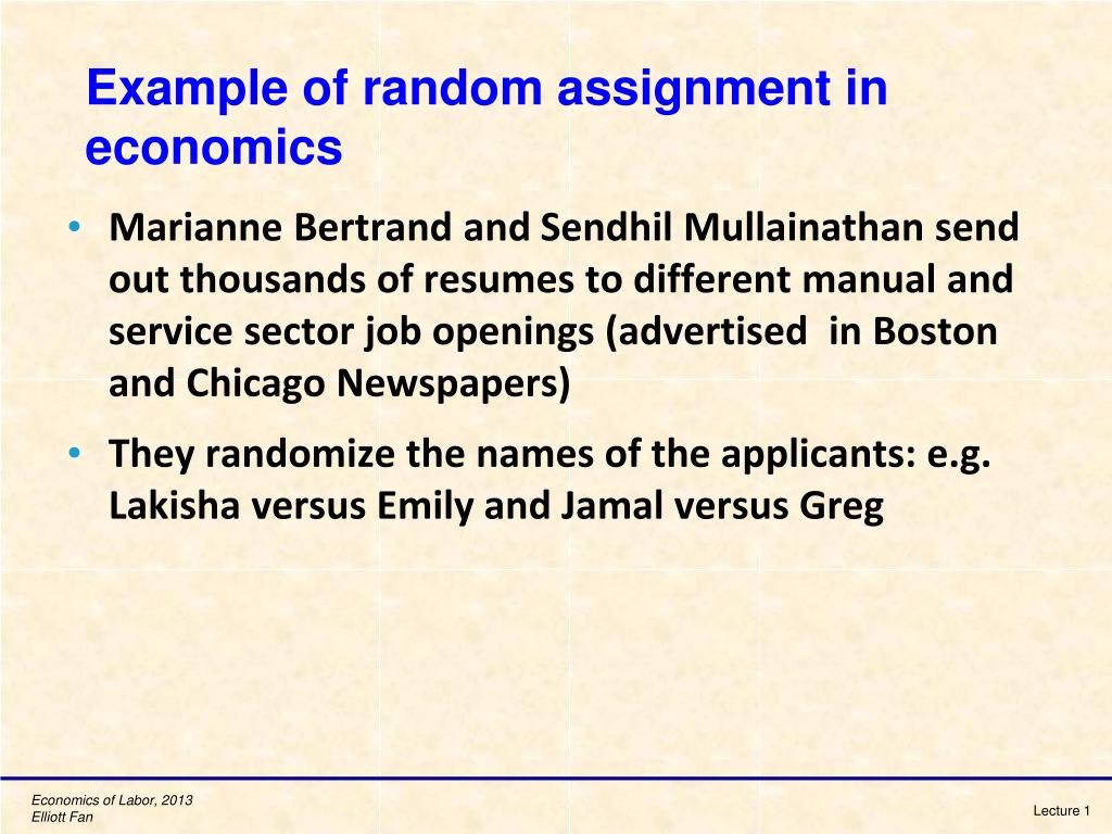 Example of random assignment in economics • Marianne Bertrand and SendhilMullainathan send out thousands of resumes to different manual and service sector job openings (advertised in Boston and Chicago Newspapers) • They randomize the names of the applicants: e.g. Lakisha versus Emily and Jamal versus Greg