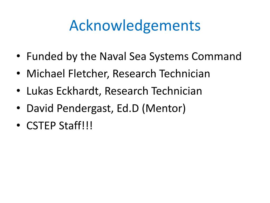 Acknowledgements • Funded by the Naval Sea Systems Command • Michael Fletcher, Research Technician • Lukas Eckhardt, Research Technician • David Pendergast, Ed.D (Mentor) • CSTEP Staff!!!